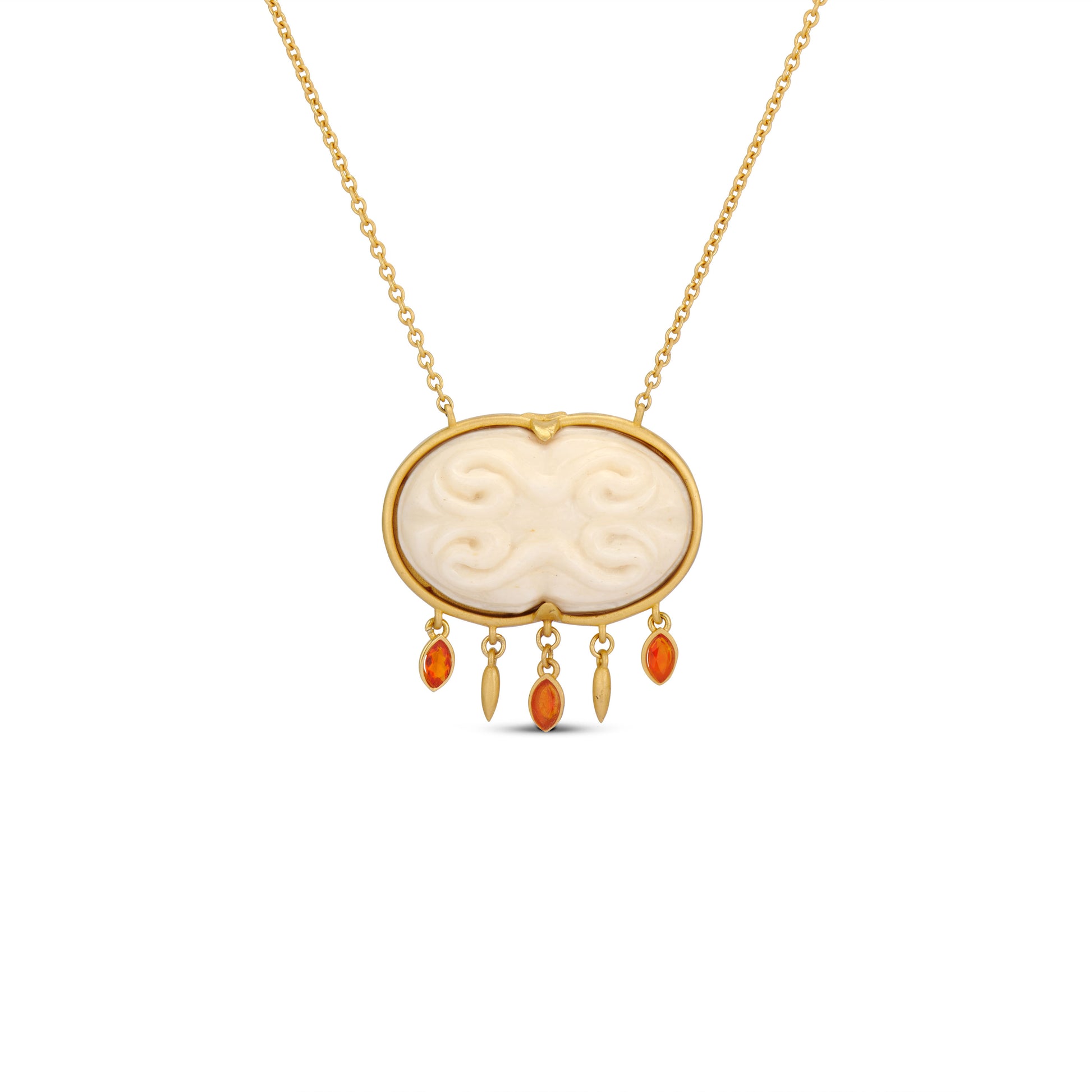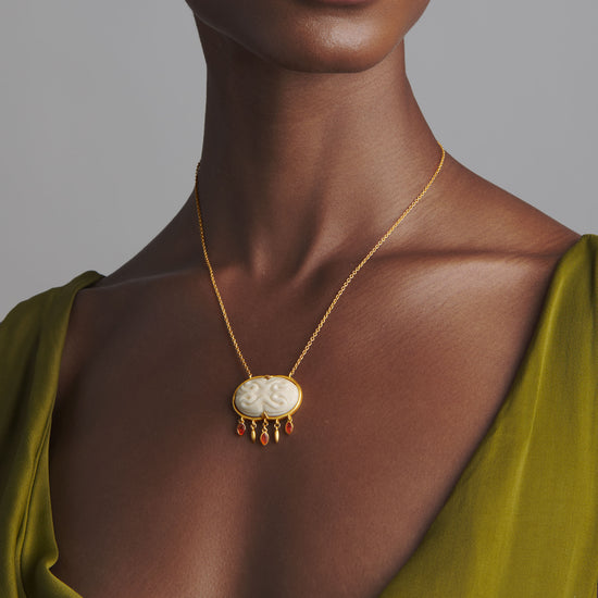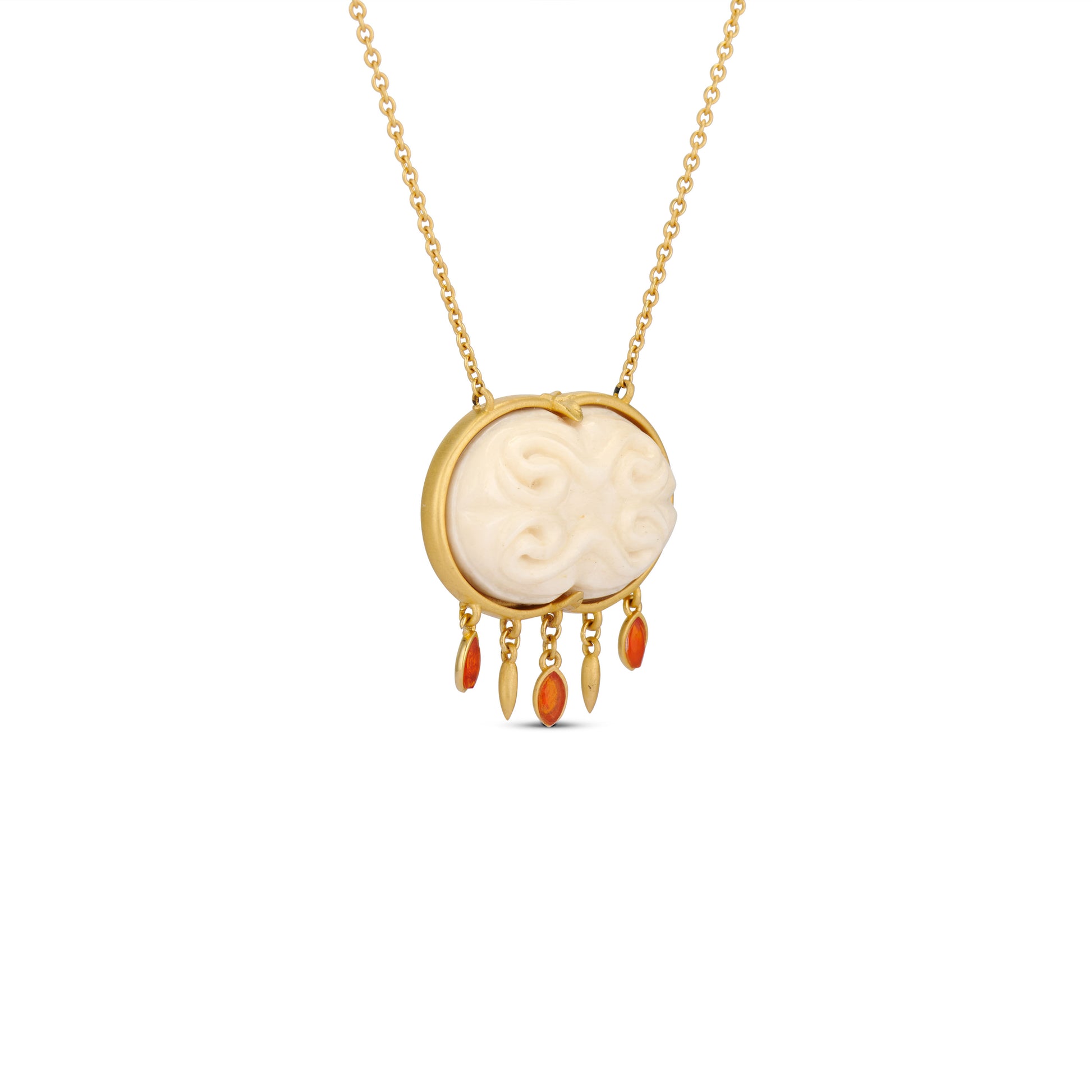The Cinched Cameo Necklace offers a modern take on the classic romantic cameo style. Complemented by Carnelian drops, this cameo features a delicately etched hourglass silhouette - corseted waist, impossible curves— that speaks to centuries of bodies molded by expectation rather than nature.