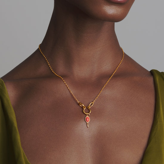 This piece is handcrafted in sterling silver with a thick gold plating featuring a coral stone.