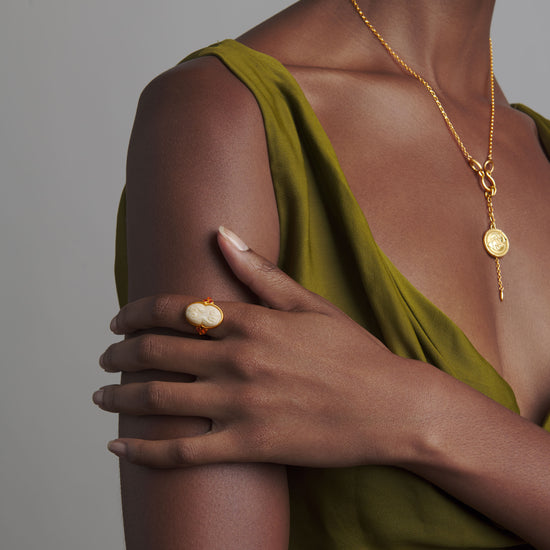 The Cinched Cameo Ring offers a modern take on the classic romantic cameo style. Flanked by a trio of carnelian stones, the cameo features a delicately etched hourglass silhouette - corseted waist, impossible curves— that speaks to centuries of bodies molded by expectation rather than nature.
